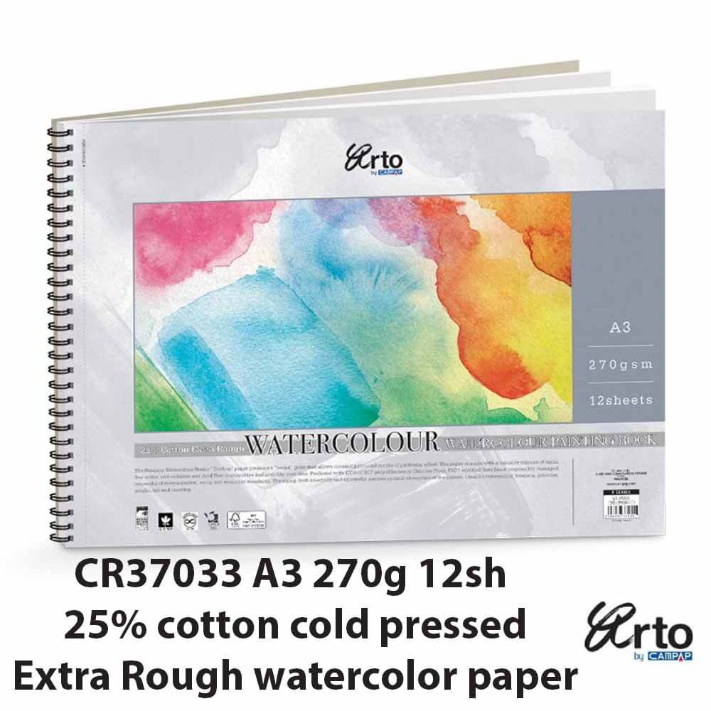 The Arto CR37033 & CR37034 Watercolour Pads are designed for artists seeking high-quality paper for their watercolor projects. Each pad contains 12 sheets of 300gsm extra rough cold-pressed paper made from a blend of 25% cotton and 75% cellulose, sourced from Italy.