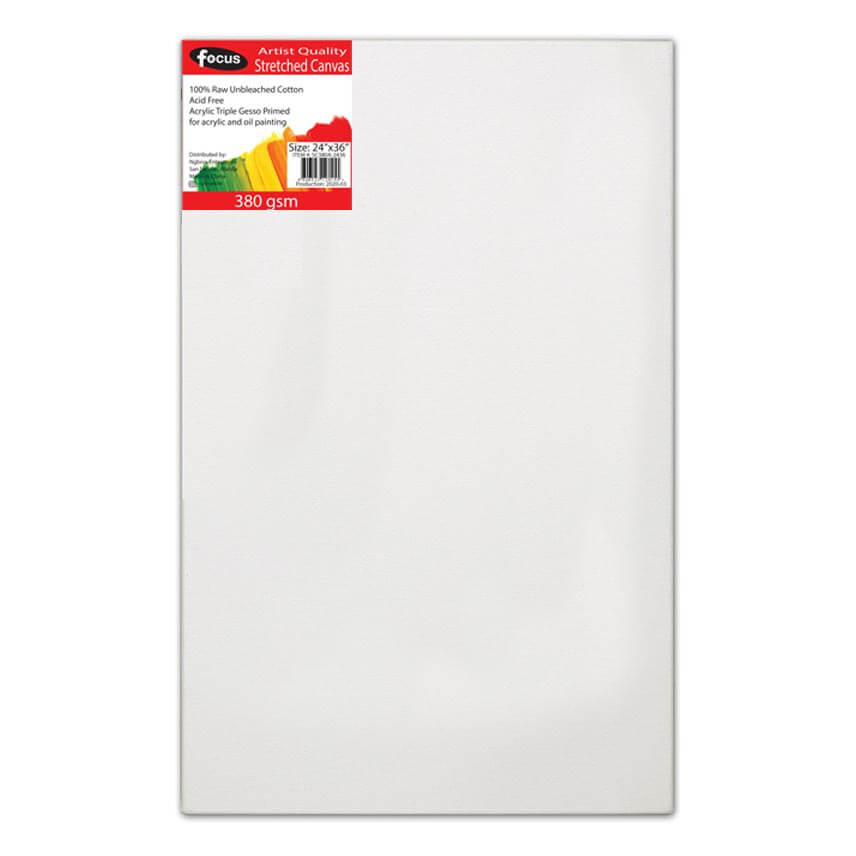 Focus Stretched Canvas 380gsm is an extra-thick, professional-grade canvas designed for artists who demand premium quality and durability. Built with kiln-dried wooden stretchers to prevent warping, it offers a strong and stable foundation for heavy paint applications. Made from 100% raw, unbleached cotton, this 380gsm canvas delivers superior strength, long shelf life, and enhanced surface grip. Triple primed with high-quality acrylic gesso, it provides a smooth, absorbent surface ideal for both acrylic and oil paints. Pre-stretched to perfect tension and complete with adjustable wedges, it’s the go-to choice for serious painters, art students, and studio professionals.